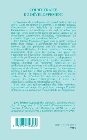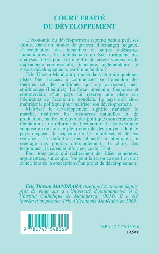 Dans un monde de guerres, d'échanges inégaux, d'accentuation des inégalités et autres "désastres humanitaires", les intellectuels du Sud formulent des analyses fortes pour sortir du cercle vicieux de la dépendance commerciale, financière, réglementaire. L'auteur propose dans ce traité quelques pistes, à commencer par l'abandon des théories (et des politiques qui s'y associent) néosmithiennes (libérales). La force monétaire, financière et commerciale d'un pays lui réserve une place sur l'échiquier de l'économie mondiale. Le pays doit alors maîtriser le politique pour maîtriser son développement.