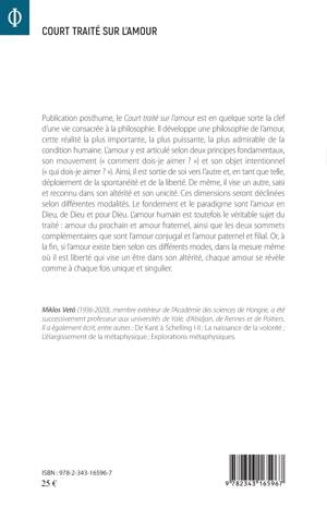Publication posthume, le Court traité sur l'amour est en quelque sorte la clef d'une vie consacrée à la philosophie. Il développe une philosophie de l'amour, cette réalité la plus importante, la plus puissante, la plus admirable de la condition humaine. L'amour y est articulé selon deux principes fondamentaux, son mouvement et son objet intentionnel. Il vise un autre, saisi et reconnu dans son altérité et son unicité. Ces dimensions seront déclinées selon différentes modalités. Le fondement et le paradigme sont l'amour en Dieu, de Dieu et pour Dieu. L'amour humain est toutefois le véritable sujet du traité : amour du prochain et amour fraternel, ainsi que les deux sommets complémentaires que sont l'amour conjugal et l'amour paternel et filial.
