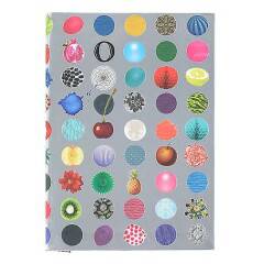 The front cover features couture candies lined up in a row on a shiny silver foil cover. Includes end paper ribbons that turn into the word Lacroix tossed with gold stars and one full page of magnificent butterfly stickers printed on clear acetate. Also includes pink page edges, a black-and-white chevron striped ribbon marker and a gold foil belly band that has a hot-stamped Christian Lacroix Paris logo.