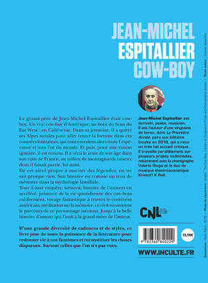 Le grand-père de Jean-Michel Espitallier était cow-boy. Un vrai cow-boy d'Amérique, au bout du bout du Far West : en Californie. Dans sa jeunesse, il a quitté ses Alpes natales pour aller tenter la fortune dans ces contrées lointaines qui condensaient alors toute l'espérance et tout l'or du monde. Et puis, pour une raison inconnue, il est revenu. Il a vécu le reste de son âge dans son coin de France, au milieu de montagnards taiseux dont il faisait partie, lui aussi.