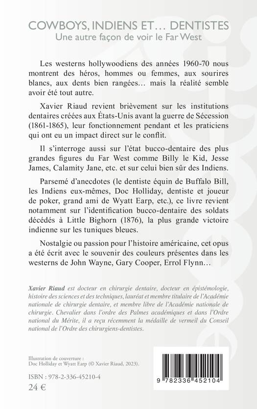 Les westerns hollywoodiens des années 1960-70 nous montrent des héros, hommes ou femmes, aux sourires blancs, aux dents bien rangées... mais la réalité semble avoir été tout autre. Xavier Riaud revient brièvement sur les institutions dentaires créées aux États-Unis avant la guerre de Sécession (1861-1865), leur fonctionnement pendant et les praticiens qui ont eu un impact direct sur le conflit. Il s'interroge aussi sur l'état bucco-dentaire des plus grandes figures du Far West comme Billy le Kid, Jesse James, Calamity Jane, etc. et sur celui bien sûr des Indiens. Parsemé d'anecdotes (le dentiste équin de Buffalo Bill, les Indiens eux-mêmes, Doc Holliday, dentiste et joueur de poker, grand ami de Wyatt Earp, etc.), ce livre revient notamment sur l'identification bucco-dentaire des soldats décédés à Little Bighorn (1876), la plus grande victoire indienne sur les tuniques bleues. Nostalgie ou passion pour l'histoire américaine, cet opus a été écrit avec le souvenir des couleurs présentes dans les westerns de John Wayne, Gary Cooper, Errol Flynn...