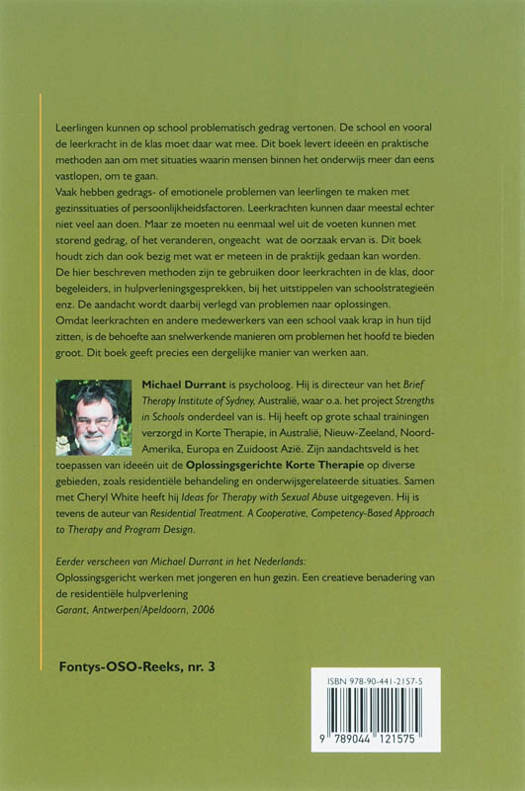 Leerlingen kunnen op school problematisch gedrag vertonen. De school en vooral deleerkracht in de klas moet daar wat mee. Dit boek levert ideeën en praktische methoden aan om met situaties waarin mensen binnen het onderwijs meer dan eens vastlopen, om te gaan. Vaak hebben gedrags-of emotionele problemen van leerlingen te maken met gezinssituaties of persoonlijkheidsfactoren. Leerkrachten kunnen daar meestal echter niet veel aan doen. Maar ze moeten nu eenmaal wel uit de voeten kunnen met storend gedrag, of het veranderen, ongeacht wat de oorzaak ervan is. Dit boek houdt zich dan ook bezig met wat er meteen in de praktijk gedaan kan worden. De hier beschreven methoden zijn te gebruiken door leerkrachten in de klas, door begeleiders, in hulpverleningsgesprekken, bij het uitstippelen van schoolstrategieën enz. De aandacht wordt daarbij verlegd van problemen naar oplossingen. Omdat leerkrachten en andere medewerkers van een school vaak krap in hun tijd zitten, is de behoefte aan snelwerkende manieren om problemen het hoofd te bieden groot. Dit boek geeft precies een dergelijke manier van werken aan. Michael Durrant is psycholoog. Hij is directeur van het Brief Therapy Institure of Sydney, Australië, waar o.a. het project Strenghts in Schools onderdeel van is. Hij heeft op grote schaal trainingen verzorgd in Korte Therapie, in Australië, Nieuw-Zeeland, Noord-Amerika, Europa en Zuidoost Azië, Zijn aandachtsveld is het toepassen van ideeën uit de Oplossingsgerichte Korte Therapie op diverse gebieden, zoals residentiële behandeling en onderwijsgerelateerde situaties. Samen met Cheryl White heeft hij Ideas for Therapy with Sexual Abuse uitgegeven. Hij is tevens de auteur van Residential Treatment. A Cooperative, Competency-Based Approach to Therapy and Program Design. Eerder verscheen van Michael Durrant in het Nederlands: Oplossingsgericht werken met jongeren en hun gezin. Een creatieve benadering van de residentiële hulpverlening Garant, Antwerpen/Apeldoorn, 2006