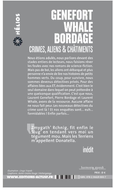 / Prix Bob Morane 2018, catégorie coup de coeur \\ Nous étions adulés, nous parlions devant des stades entiers de lecteurs, nous faisions rêver les foules avec nos romans de science-fiction. Mais pas de bol, les aliens ont débarqué et plus personne n’a envie de lire nos histoires de petits hommes verts. Du coup, pour survivre, nous sommes devenus détectives privés. Pour des affaires liées aux ET, évidemment. C’est bien le seul domaine dans lequel on peut prétendre à une quelconque qualification. C’est que nous, Laurent Genefort, Pierre Bordage et Laurent Whale, avons de la ressource. Aucune affaire ne nous fait peur. Les nouveaux détectives du crime sont là ! Et nos enquêtes sont... euh... formidables ! Enfin parfois..."Jennifer a disparu" de Laurent Genefort"Où es-tu, mon Choo ?" de Pierre Bordage"L'Affaire du FBG" de Laurent Whale