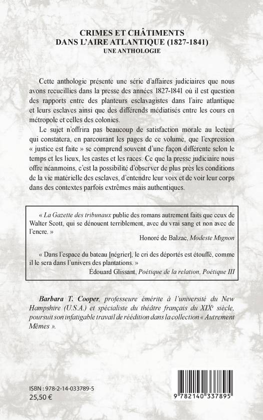 Cette anthologie présente une série d'affaires judiciaires que nous avons recueillies dans la presse des années 1827-1841 où il est question des rapports entre des planteurs esclavagistes dans l'aire atlantique et leurs esclaves ainsi que des différends médiatisés entre les cours en métropole et celles des colonies. Le sujet n'offrira pas beaucoup de satisfaction morale au lecteur qui constatera, en parcourant les pages de ce volume, que l'expression « justice est faite » se comprend souvent d'une façon différente selon le temps et les lieux, les castes et les races. Ce que la presse judiciaire nous offre néanmoins, c'est la possibilité d'observer de plus près les conditions de la vie matérielle des esclaves, d'entendre leur voix et de voir leur corps dans des contextes parfois extrêmes mais authentiques.