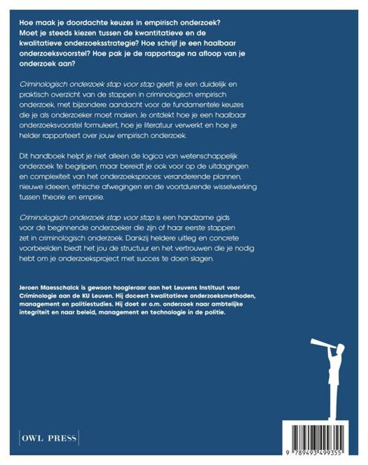 Criminologisch onderzoek stap voor stap geeft je een duidelijk en praktisch overzicht van de stappen in criminologisch empirisch onderzoek, met bijzondere aandacht voor de fundamentele keuzes die je als onderzoeker moet maken. Je ontdekt hoe je een haalbaar onderzoeksvoorstel formuleert, hoe je literatuur verwerkt en hoe je helder rapporteert over jouw empirisch onderzoek.