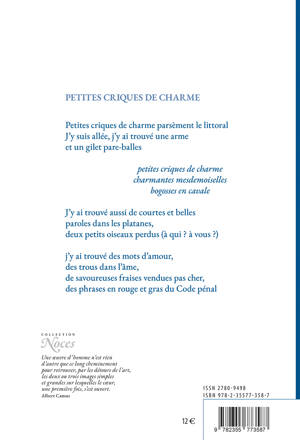 Ce recueil est divisé en deux parties distinctes. La première partie, intitulée criques, possède pour fil conducteur la présence systématique de la mer ou d’éléments maritimes dans ses poèmes. La mer, tantôt personnifiée et utilisée comme métaphore d’une mère, tantôt présente en arrière-plan, comme un décor poétique est utilisé subtilement par Katia Bouchoueva pour raconter ses visions du monde. La seconde partie du recueil, plus courte, nommée Deux nuits à Barcelone possède quant à elle une dimension plus politique. On le ressent notamment dans les poèmes première nuit et deuxième nuit qui évoquent les souffrances pleines d’humanité de dictateurs vus comme immuables. Peut-être est-ce une réflexion plus profonde, sur l’absurdité de toutes ces croyances politiques ou religieuses, mais il appartient à chacun d’interpréter à sa manière ces poèmes chargés de sens. Katia Bouchoueva possède une écriture parfois crue, souvent forte et toujours juste. Ses poèmes, plutôt courts, ne font pas réfléchir, ils font penser. L’ensemble de son ouvrage est un peu à l’image de ces quelques vers : La vie / c’est-à-dire les mots du dedans / par la fenêtre d’en haut L’enfer / c’est-à-dire les mots du dehors / par la porte d’en bas D’une grande pureté.