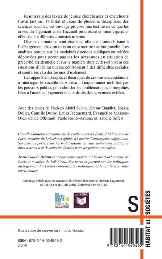 Réunissant des textes de jeunes chercheuses et chercheurs travaillant sur l'habitat et issus de plusieurs disciplines des sciences sociales, cet ouvrage propose une lecture de ce que les crises du logement et de l'accueil produisent comme enjeux et effets dans différents contextes urbains. Diverses situations sont étudiées, allant du sans-abrisme à l'hébergement chez un tiers ou en structure institutionnelle. Les analyses portent sur les modalités d'actions publiques ou privées déployées pour accompagner les personnes en situation de précarité résidentielle et sur la manière dont celles-ci vivent ces situations d'habitat qui les confrontent à des difficultés sociales et sanitaires et à des formes d'isolement. Les apports empiriques et théoriques de ces travaux conduisent à interroger le vocable de crise fréquemment mobilisé par les pouvoirs publics pour aborder les problématiques d'inégalités liées à l'accès au logement et aux droits des personnes exilées.