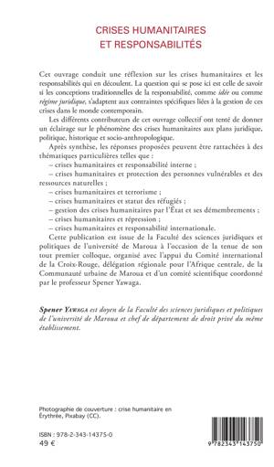 Cet ouvrage conduit une réflexion sur les crises humanitaires et les responsabilités qui en découlent. La question est de savoir si les conceptions traditionnelles de la responsabilité, comme idée ou comme régime juridique, s'adaptent aux contraintes spécifiques liées à la gestion de ces crises dans le monde contemporain. Les contributeurs de ce livre ont tenté de donner un éclairage sur le phénomène des crises humanitaires aux plans juridique, politique, historique et socio-anthropologique.