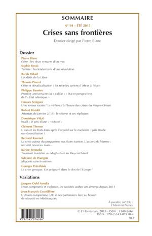 Au sommaire de ce numéro : Tunisie : les lendemains d'une révolution ; Les défis de la Libye ; Crise et déradicalisation : les rebelles syriens d'Ahrar al-Sham ; premier anniversaire du "califat" : état et perspectives de l'"Etat islamique" ; Une terreur sacrée ? La violence à l'heure des crises du Moyen-Orient ; Attentas de janvier 2015 : le séisme et ses répliques ; Israël : le prix d'une "victoire" ; L'Iran et les Etats-Unis après l'accord sur le nucléaire ; Migrants sans frontières ; La crise grecque. Un poignard dans le dos de l'Europe.