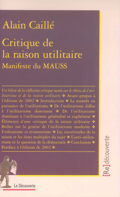 , a peu à peu pris des allures de livre culte et exercé une influence souterraine sur des pans importants de la sociologie, de l'anthropologie, de la science économique ou de la philosophie morale et politique. C'est que l'objectif premier du MAUSS –; " Montrer que l'obstacle principal sur lequel bute la pensée moderne est celui de l'économisme, [...] que c'est lui qui souffle l'essentiel des réponses et qui limite abusivement le champ du possible et du concevable " –; est devenu chaque jour plus actuel. Aujourd'hui, nous y sommes en plein. Ce n'est plus seulement la pensée qui se dissout dans l'économisme, c'est le rapport social lui-même qui se dilue dans le marché. D'où la nécessité urgente de chercher des ressources théoriques et pratiques qui permettent de sauvegarder l'essentiel, la civilité ordinaire et le goût de ce qui fait sens par soi-même, à commencer par celui de la démocratie. Épuisé depuis plusieurs années, ce livre est réédité avec un avant-propos et une postface inédits qui permettent également d'introduire le lecteur aux analyses ultérieures du MAUSS sur la genèse de l'utilitarisme (et donc de l'économisme) et sur le paradigme du don.