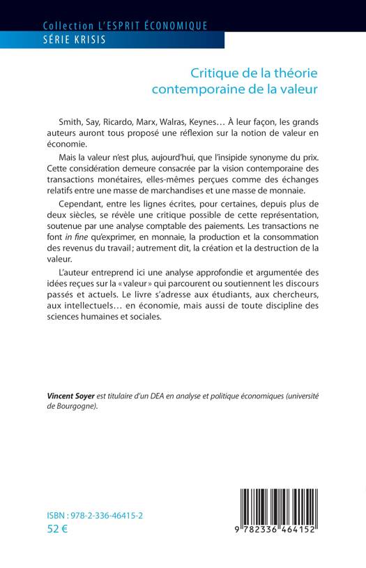 Smith, Say, Ricardo, Marx, Walras, Keynes... À leur façon, les grands auteurs auront tous proposé une réflexion sur la notion de valeur en économie. Mais la valeur n'est plus, aujourd'hui, que l'insipide synonyme du prix. Cette considération demeure consacrée par la vision contemporaine des transactions monétaires, elles-mêmes perçues comme des échanges relatifs entre une masse de marchandises et une masse de monnaie. Cependant, entre les lignes écrites, pour certaines, depuis plus de deux siècles, se révèle une critique possible de cette représentation, soutenue par une analyse comptable des paiements. Les transactions ne font in fine qu'exprimer, en monnaie, la production et la consommation des revenus du travail; autrement dit, la création et la destruction de la valeur. L'auteur entreprend ici une analyse approfondie et argumentée des idées reçues sur la valeur qui parcourent ou soutiennent les discours passés et actuels. Le livre s'adresse aux étudiants, aux chercheurs aux intellectuels... en économie, mais aussi de toute discipline des sciences humaines et sociales.