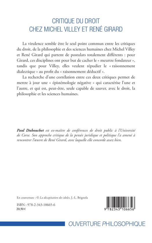 La virulence parait être le point commun entre Michel Villey et René Girard. Pour René Girard, droit, philosophie et sciences humaines ont pour but de cacher le "meurtre fondateur" tandis que pour Villey elles veulent répudier le "raisonnement dialectique" au profit du "raisonnement déductif". Mettre en rapport ces deux critiques permet de révéler une "épistémologie négative", seule capable de sauver, avec le droit, la philosophie et les sciences humaines.