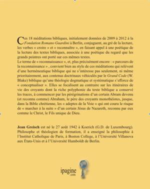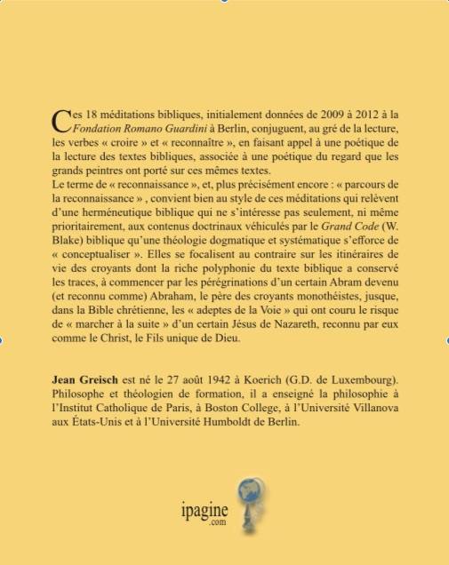 CROIRE Le terme de "parcours de la reconnaissance" convient bien au style de ces 18 Méditations bibliques... "Croire"et"reconnaitre"une poétique de la lecture des textes bibliques, associée à une poétique du regard porté par les grands peintres sur ces mêmes textes! Bien que le sujet soit profond, l’expression est vivante, subtile et moderne. Nul besoin d'être théologien...pour comprendre et apprécier. Ne boudons pas le plaisir de cette pensée revigorante.