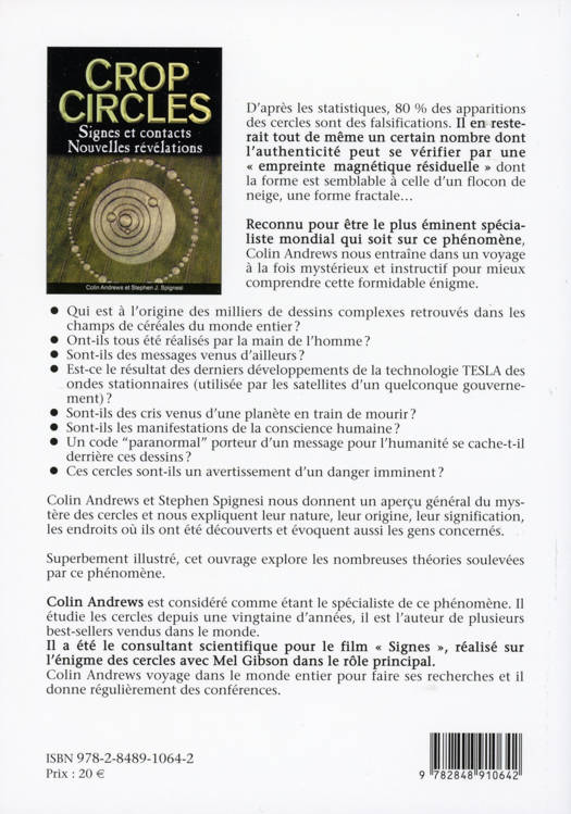 D'après les statistiques, 80 % des apparitions des cercles sont des falsifications. Il en resterait tout de même un certain nombre dont l'authenticité peut se vérifier par une " empreinte magnétique résiduelle " dont la forme est semblable à celle d'un flocon de neige, une forme fractale... Reconnu pour être le plus éminent spécialiste mondial qui soit sur ce phénomène, Colin Andrews nous entraîne dans un voyage à la fois mystérieux et instructif pour mieux comprendre cette formidable énigme. Qui est à l'origine des milliers de dessins complexes retrouvés dans les champs de céréales du monde entier ? Ont-ils tous été réalisés par la main de l'homme ? Sont-ils des messages venus d'ailleurs ? Est-ce le résultat des derniers développements de la technologie TESLA des ondes stationnaires (utilisée par les satellites d'un quelconque gouvernement) ? Sont-ils des cris venus d'une planète en train de mourir ? Sont-ils les manifestations de la conscience humaine ? Un code "paranormal" porteur d'un message pour l'humanité se cache-t-il derrière ces dessins ? Ces cercles sont-ils un avertissement d'un danger imminent ? Colin Andrews et Stephen Spignesi nous donnent un aperçu général du mystère des cercles et nous expliquent leur nature, leur origine, leur signification, les endroits où ils ont été découverts et évoquent aussi les gens concernés. Superbement illustré, cet ouvrage explore les nombreuses théories soulevées par ce phénomène.