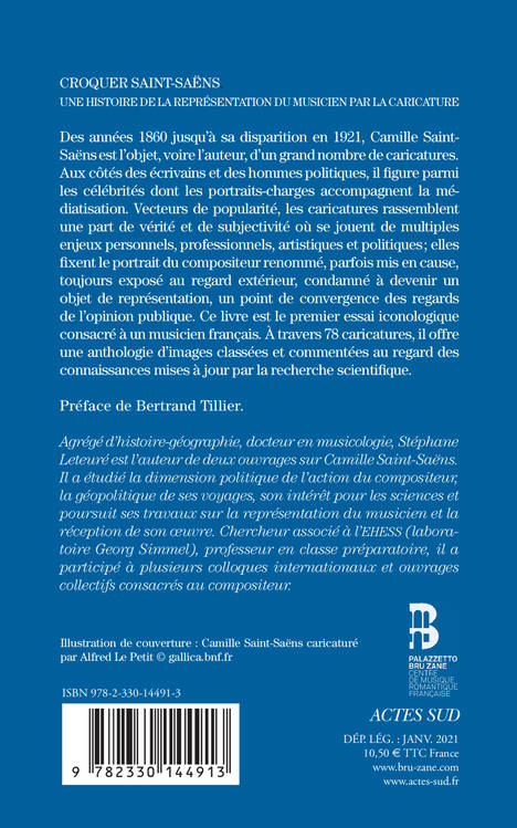 Des années 1860 jusqu'à sa disparition en 1921, Camille Saint-Saëns est l'objet, voire l'auteur, d'un grand nombre de caricatures. Aux côtés des écrivains et des hommes politiques, il figure parmi les célébrités dont les portraits-charges accompagnent la médiatisation. Vecteurs de popularité, les caricatures rassemblent une part de vérité et de subjectivité où se jouent de multiples enjeux personnels, professionnels, artistiques et politiques ; elles fixent le portrait du compositeur renommé, parfois mis en cause, toujours exposé au regard extérieur, condamné à devenir un objet de représentation, un point de convergence des regards de l'opinion publique. Ce livre est le premier essai iconologique consacré à un musicien français. À travers 78 caricatures, il offre une anthologie d'images classées et commentées au regard des connaissances mises à jour par la recherche scientifique.