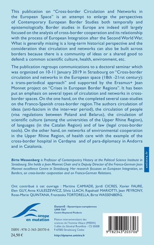 The publication regroups communications to a doctoral seminar which was organized on 10-11 January 2019 in Strasbourg on « Cross-border circulation and networks in the European space (18th -21rst century) : a trans-periodical approach » and supported by the Erasmus+ Jean Monnet project on « Crises in European Border Regions ». It has been put an emphasis on several types of circulation and networks in cross- border spaces. On the one hand, on the completed several case-studies on the Franco-Spanish cross-border region. The authors circulation of ideas (anti-fascism in the inter-war period), the circulation of people (visa regulations between Poland and Belarus), the circulation of scientific culture (among the universities of the Upper Rhine Region), of languages (in the Catalan Region) and of law (legal cross-border tools). On the other hand, on networks of environmental cooperation in the Upper Rhine Region, of health care with the example of the cross-border hospital in Cerdayna and of para-diplomacy in Andorra and in Catalonia.