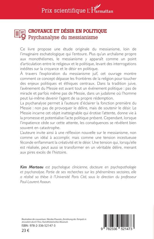 Ce livre propose une étude originale du messianisme, loin de l'imaginaire eschatologique qui l'entoure. Plus qu'un archaïsme propre aux monothéismes, le messianisme y apparaît comme un point d'articulation entre le religieux et le politique, levant des interrogations inédites sur la croyance et le désir en politique. À travers l'exploration du messianisme juif, cet ouvrage montre comment ce concept dépasse les frontières de la religion pour toucher des enjeux politiques et éthiques centraux. Dans la tradition juive, l'avènement du Messie est avant tout un événement politique pas de miracle et parfois même pas de Messie, dans un judaïsme où l'homme peut lui-même devenir l'agent de sa propre rédemption. La psychanalyse permet à l'auteure d'éclairer la fonction première du Messie non pas de provoquer le délire, mais de soutenir le désir. Le Messie incarne cet objet inatteignable qui érotise l'attente, donne vie à la promesse et potentialise l'acte politique présent. Cependant, lorsque l'impatience cède sur cette attente, les conséquences se révèlent bien souvent en catastrophe. L'auteure invite ainsi à une réflexion nouvelle sur le messianisme, non comme un idéal à accomplir, mais comme une tension incestueuse féconde enflammant la créativité et le désir. Une tension qui, lorsqu'elle est réalisée, peut aussi se transformer en un véritable délire, menant aux pires excès de l'histoire.