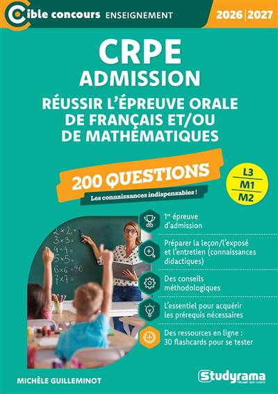 Il vous accompagne dans la préparation de la première épreuve orale d'admission du CRPE, épreuve d'exposé sur une notion de français ou de mathématiques (L3), ou épreuve de leçon (M2), qui consiste en la conception et l'animation de deux séances d'enseignement, l'une en français et l'autre en mathématiques. Chaque exposé de 10 à 15 minutes est suivi d'un entretien avec le jury.
