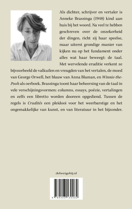 Als dichter, schrijver en vertaler is Anneke Brassinga kind aan huis bij het woord. Na veel te hebben geschreven over de onzekerheid der dingen, richt zij haar speelse, maar uiterst grondige manier van kijken nu op het fundament onder alles wat haar beweegt: de taal. Met wervelende eruditie verkent ze bijvoorbeeld de valkuilen en vreugden van het vertalen, de moed van George Orwell, het blauw van Anna Blaman, en Winnie-the-Pooh als oerboek. Brassinga toont haar beheersing van de taal in vele verschijningsvormen: columns, essays, poëzie, vertalingen, en zelfs een libretto worden dooreen opgediend. Tussen de regels is Crudités een pleidooi voor het weerbarstige en het ongemakkelijke van kunst en van literatuur in het bijzonder.