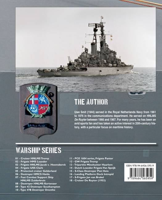 HNLMS De Ruyter and HNLMS De Zeven Provinciën were the last cruisers in the world to be armed solely with guns. Both ships completed service within the Royal Netherlands Navy and Peruvian Navy. The initial design, dated 15 November 1937, was never brought to fruition. After WWII, the ships were still under construction, resulting in a renewed design process. HNMLS De Ruyter was commissioned on 18 November 1953 and mainly served as flagship of a task group. On 13 February 1972, she was transferred to Peru as BAP Almirante Grau and was finally decommissioned after 64 years on 26 September 2017.
