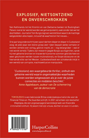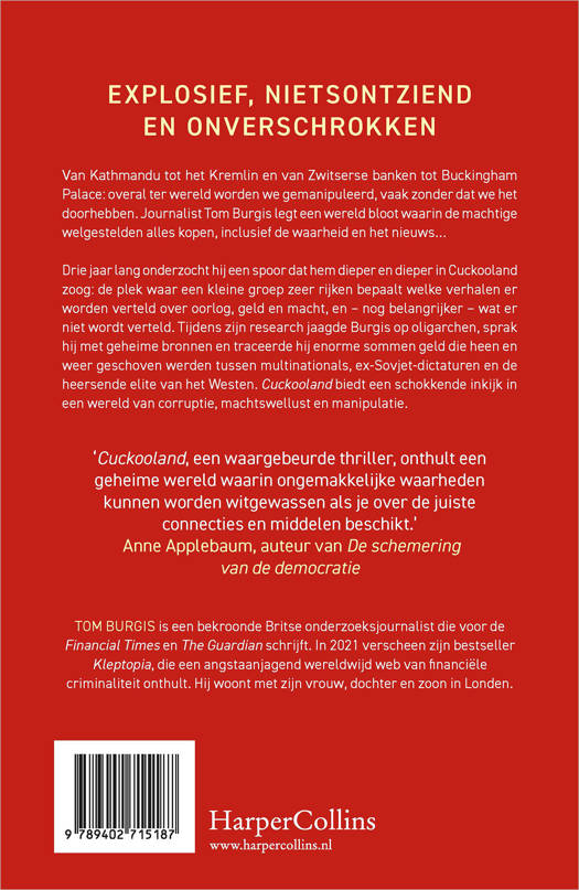 Drie jaar lang onderzocht hij een spoor dat hem dieper en dieper in Cuckooland zoog: de plek waar een kleine groep zeer rijken bepaalt welke verhalen er worden verteld over oorlog, geld en macht , en – nog belangrijker – wat er niet wordt verteld. Tijdens zijn research jaagde Burgis op oligarchen, sprak hij met geheime bronnen en traceerde hij enorme sommen geld die heen en weer geschoven werden tussen multinationals, ex-Sovjet-dictaturen en de heersende elite van het Westen.