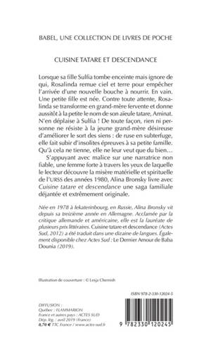 S'appuyant avec malice sur une narratrice non fiable, une femme forte à travers les yeux de laquelle le lecteur découvre la misère matérielle et spirituelle de l'URSS des années 1980, Alina Bronsky livre avec Cuisine tatare et descendance une saga familiale déjantée et extrêmement originale.