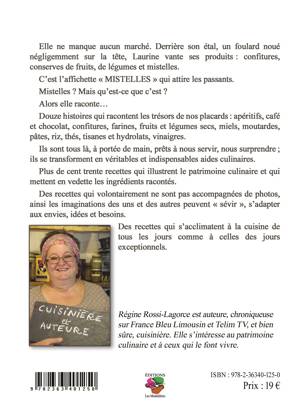 Elle ne manque aucun marché. Derrière son étal, un foulard noué négligemment sur la tête, Laurine vante ses produits : confitures, conserves de fruits, de légumes et mistelles. C’est l’affichette « MISTELLES » qui attire les passants.Mistelles ? Mais qu’est-ce que c’est ? Alors elle raconte… Douze histoires qui racontent les trésors de nos placards : apéritifs, café et chocolat, confitures, farines, fruits et légumes secs, miels, moutardes, pâtes, riz, thés, tisanes et hydrolats, vinaigres… Ils sont tous là, à portée de main, prêts à nous servir, nous surprendre ; ils se transforment en véritables et indispensables aides culinaires.