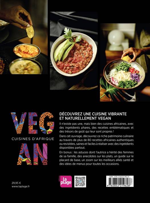 DÉCOUVREZ UNE CUISINE VIBRANTE ET NATURELLEMENT VEGAN. Il n’existe pas une, mais bien des cuisines africaines, avec des ingrédients phares, des recettes emblématiques et des trésors de goût qui leur sont propres ! Dans cet ouvrage, découvrez ce riche patrimoine culinaire au travers de plus de 80 recettes africaines authentiques ou revisitées, saines et faciles à réaliser avec des ingrédients disponibles partout. En bonus : les astuces dont l’autrice a hérité des femmes de sa famille, des anecdotes sur les plats, un guide sur le placard de base, un zoom sur les meilleurs alliés santé et des idées de menus pour toutes les occasions