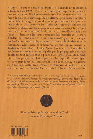 Qu'est-ce que la culture de droite ? Furio Jesi consacre les études ici réunies à l'analyse des matrices souterraines, du langage et des manifestations des « idées sans mots » de la culture de droite du dix-neuvième siècle , ce faisant il démasque les lieux communs, les formules et les mots d'ordres qui font allusion à un noyau mythique : les principes récurrents de Tradition, Passé, Race, Origine, Sacré. Dans cette perspective, l'auteur enquête sur les appareils linguistiques et iconographiques qui sous-tendent le néo-fascisme, le nazisme et le racisme , et sur les matériaux mythologiques manipulés par la propagande politique de droite pour légitimer son pouvoir et l'ordre social dominant.