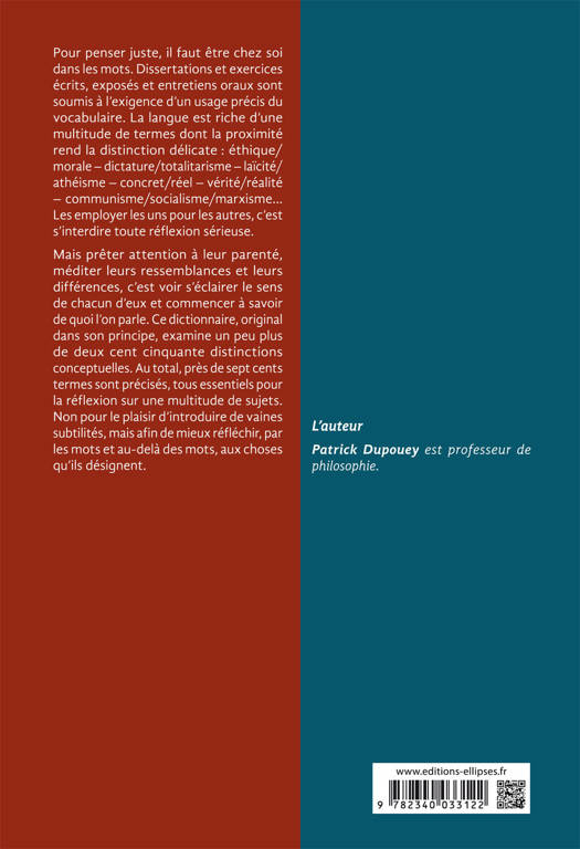 Pour penser juste, il faut être chez soi dans les mots. Dissertations et exercices écrits, exposés et entretiens oraux sont soumis à l'exigence d'un usage précis du vocabulaire. La langue est riche d'une multitude de termes dont la proximité rend la distinction délicate : - éthique / morale - dictature / totalitarisme - laïcité / athéisme - concret / réel - vérité / réalité - communisme / socialisme / marxisme - ... Les employer les uns pour les autres, c'est s'interdire toute réflexion sérieuse.