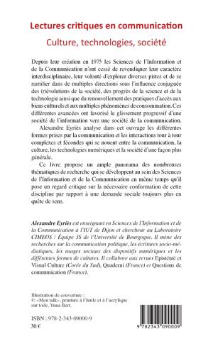 L'auteur analyse les différentes formes prises par la communication et les interactions tour à tour complexes et fécondes qui se nouent entre la communication, la culture, les technologies numériques et la société d'une façon plus générale. Ce livre propose un ample panorama des nombreuses thématiques de recherche qui se développent au sein des Sciences de l'Information et de la Communication en même temps qu'il pose un regard critique sur la nécessaire conformation de cette discipline par rapport à une demande sociale toujours plus en quête de sens.