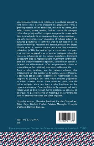 Longtemps négligées, voire méprisées, les cultures populaires font l'objet d'un intérêt croissant en géographie. Comment structurent-elles les représentations ? Comment contribuent-elles à la création d'identités spatiales, culturelles et sociales ? Trois articles focalisent sur des espaces urbains, plus précisément sur des quartiers à Bruxelles, Liège et Palerme, y abordant des questions d'identité, de reconversion et du rapport au politique. Les liens entre cultures populaires et milieu ouvrier, autour d'une usine en Isère, sont de même analysés, alors que deux articles se focalisent sur les représentations par l'intermédiaire de la musique folk rock (États-Unis) et d'un festival, Gorée Diaspora, au Sénégal.