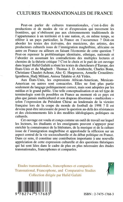 Peut-on parler de cultures transnationales, c'est-à-dire de productions et de modes de vie et d'expression qui traversent les frontières, qui n'obéissent pas aux cloisonnements traditionnels de l'appartenance à un territoire et à une nation, et , en même temps, se référer à un pays particulier, la France en l'occurrence ? Doit-on aborder les textes des écrivains, des musiciens, des artistes, des producteurs culturels issus de l'immigration maghrébine, africaine ou autre en France ou ailleurs en faisant l'économie de cette question ?