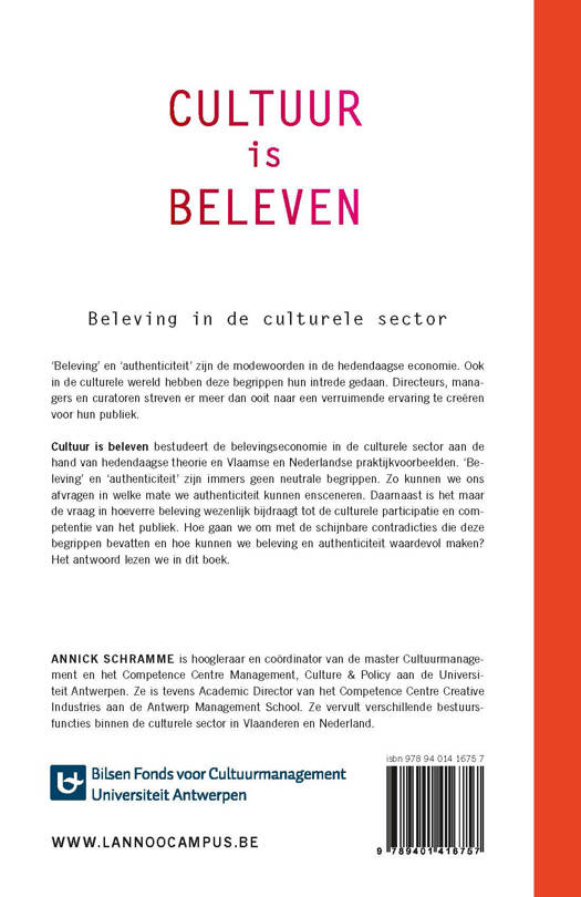 Een kritische blik op de beleveniseconomie 'Beleving' en 'authenticiteit' zijn de modewoorden in de hedendaagse economie. Ook in de culturele wereld hebben deze begrippen hun intrede gedaan. Directeurs, managers en curatoren streven er meer dan ooit naar een verruimende ervaring te creëren voor hun publiek. Cultuur is beleven bestudeert de belevingseconomie in de culturele sector aan de hand van hedendaagse theorie en Vlaamse en Nederlandse praktijkvoorbeelden. 'Beleving' en 'authenticiteit' zijn immers geen neutrale begrippen. Zo kunnen we ons afvragen in welke mate we authenticiteit kunnen ensceneren. Daarnaast is het maar de vraag in hoeverre beleving wezenlijk bijdraagt tot de culturele participatie en competentie van het publiek. Hoe gaan we om met de schijnbare contradicties die deze begrippen bevatten en hoe kunnen we beleving en authenticiteit waardevol maken? Het antwoord lezen we in dit boek.