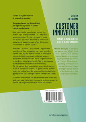 Luister naar je klanten om je strategie te bepalen Voor succesvolle organisaties van de toekomst zijn klantgerichtheid en innovatie geen tegenpolen. Om hun strategie te bepalen starten ze vanuit de markt en werken ze volgens drie basisprincipes, ofwel drie manieren van naar je klanten kijken. Allereerst scannen succesvolle organisaties voortdurend hun omgeving, alert voor signalen van de klant. Op die manier kunnen ze anticiperen op eventuele veranderingen, noden en wensen. Bovendien zien ze innovatie als de enige manier om te overleven op de lange termijn. Wat ze leren van de klant zetten ze om in werkbare verandering. Tot slot werken deze organisaties samen op die punten waar ze zelf tekortschieten. Ze gaan slimme partnerships aan en begrijpen dat samenwerking cruciaal is om goede ideeën uit te laten groeien tot commercieel succes. Customer innovation is het referentiewerk naar een marktgedreven organisatie. Voor managers, ondernemers en iedereen die wil groeien vanuit de noden van klanten.