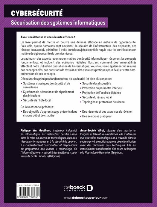 Les auteurs, experts reconnus de la sécurité informatique, abordent les sujets essentiels en matière de cybersécurité (en particulier pour se former aux certifications, Framework NIST). Ce livre couvre les quatre défis posés par la création d’un système de sécurité informatique efficace. Sécurisation :