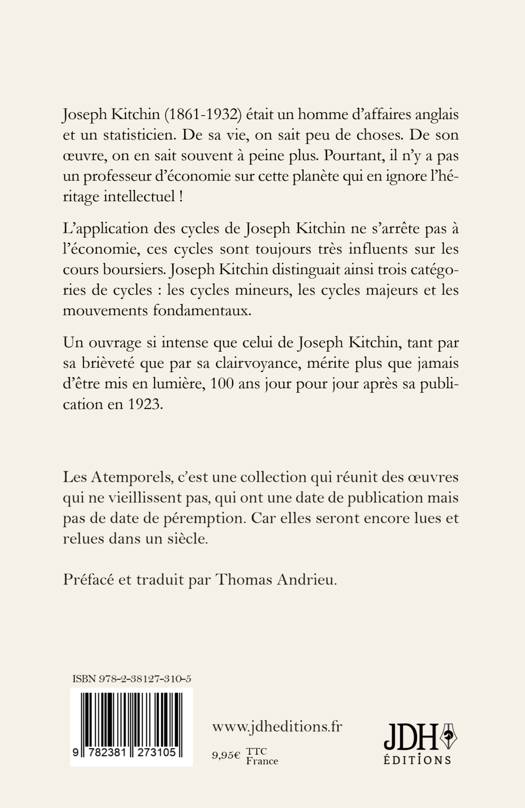 Joseph Kitchin (1861-1932) était un homme d'affaires anglais et un statisticien. De sa vie, on sait peu de choses. De son oeuvre, on en sait souvent à peine plus. Pourtant, il n'y a pas un professeur d'économie sur cette planète qui en ignore l'héritage intellectuel ! L'application des cycles de Joseph Kitchin ne s'arrête pas à l'économie, ces cycles sont toujours très influents sur les cours boursiers. Joseph Kitchin distinguait ainsi trois catégories de cycles: les cycles mineurs, les cycles majeurs et les mouvements fondamentaux. Un ouvrage si intense que celui de Joseph Kitchin, tant par sa brièveté que par sa clairvoyance, mérite plus que jamais d'être mis en lumière, 100 ans jour pour jour après sa publication en 1923. Les Atemporels, c'est une collection qui réunit des oeuvres qui ne vieillissent pas, qui ont une date de publication mais pas de date de péremption. Car elles seront encore lues et relues dans un siècle. Préfacé et traduit par Thomas Andrieu.