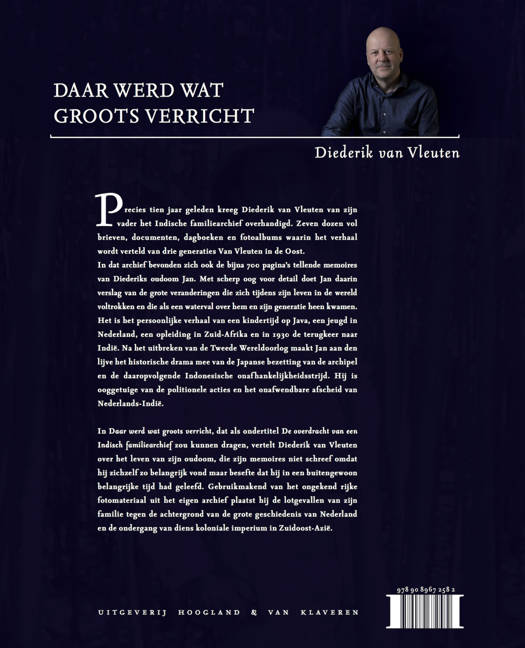 In 'Daar werd wat groots verricht', dat als ondertitel 'De overdracht van een Indisch familiearchief' zou kunnen dragen, vertelt Diederik van Vleuten over het leven van zijn oudoom, die zijn memoires niet schreef omdat hij zichzelf zo belangrijk vond maar besefte dat hij in een buitengewoon belangrijke tijd had geleefd. Gebruikmakend van het ongekend rijke fotomateriaal uit het eigen archief plaatst hij de lotgevallen van zijn familie tegen de achtergrond van de grote geschiedenis van Nederland en de ondergang van diens koloniale imperium in Zuidoost-Azië.