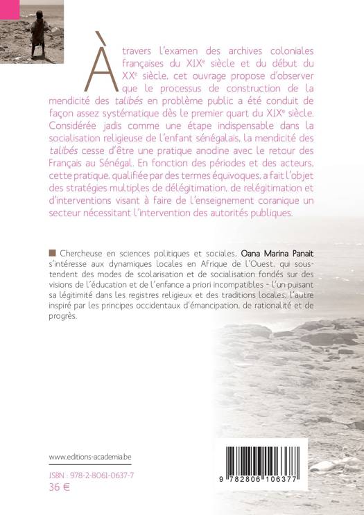 À travers l'examen des archives coloniales françaises du XIXe siècle et du début du XXe siècle, cet ouvrage propose d'observer que le processus de construction de la mendicité des talibés en problème public a été conduit de façon assez systématique dès le premier quart du XIXe siècle. Considérée jadis comme une étape indispensable dans la socialisation religieuse de l'enfant sénégalais, la mendicité des talibés cesse d'être une pratique anodine avec le retour des Français au Sénégal.