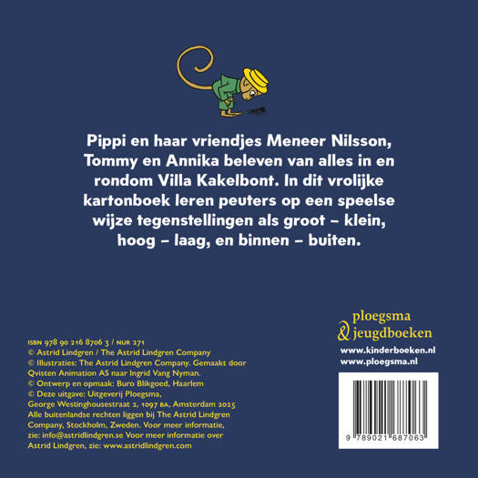 Een vrolijk kartonboek over Pippi Langkous, waarin kleintjes kennismaken met zeven tegenstellingen, waaronder groot en klein én alleen en samen.