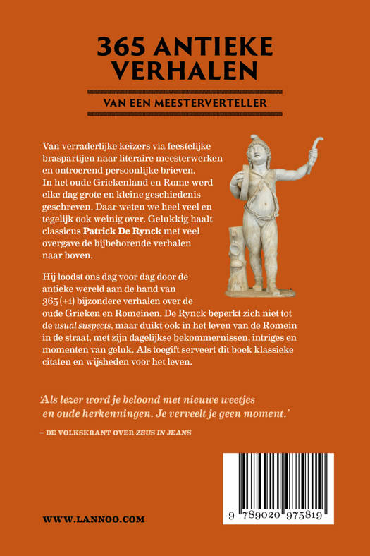 Van verraderlijke keizers via feestelijke braspartijen naar literaire meesterwerken en ontroerend persoonlijke brieven. In het oude Griekenland en Rome werd elke dag grote en kleine geschiedenis geschreven. Daar weten we heel veel en tegelijk ook weinig over. Gelukkig haalt classicus Patrick De Rynck met veel overgave de bijbehorende verhalen naar boven. Hij loodst ons dag voor dag door de antieke wereld aan de hand van 365 (+1) bijzondere verhalen over de oude Grieken en Romeinen. De Rynck beperkt zich niet tot de usual suspects, maar duikt ook in het leven van de Romein in de straat, met zijn dagelijkse bekommernissen, intriges en momenten van geluk. Als toegift serveert dit boek klassieke citaten en wijsheden voor het leven. Een greep uit de inhoud:
