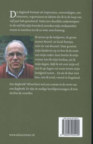 Dit dagboek bestaat uit impressies, reisverslagen, sentimenten, ergernissen en ideeën die ik in de loop van vijf jaar heb genoteerd. Vaak over dezelfde onderwerpen: in de stal bij mijn boerderij stonden mijn stokpaarden trouw te wachten tot ik ze weer eens besteeg. Ik woon op de taalgrens, de grens tussen Noord- en Zuid-Europa, niet ver van Brussel. Daar groeien mijn kinderen op en ben ik de zoon van mijn vader; daar bemin ik mijn vrouw, lees ik mijn boeken, tel ik mijn dagen, kijk ik uit over mijn erf, dat ik op dagen vol zoete ironie mijn landgoed noem En als ik daar niet ben, reis ik rond, vooral in Engeland. Een dagboek? Misschien wel een roman in de vorm van een dagboek. Er zijn de nodige hoofdpersonages; ik ben slechts de verteller.