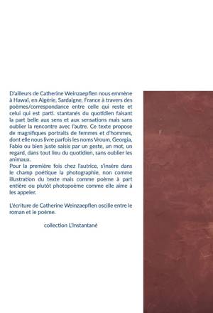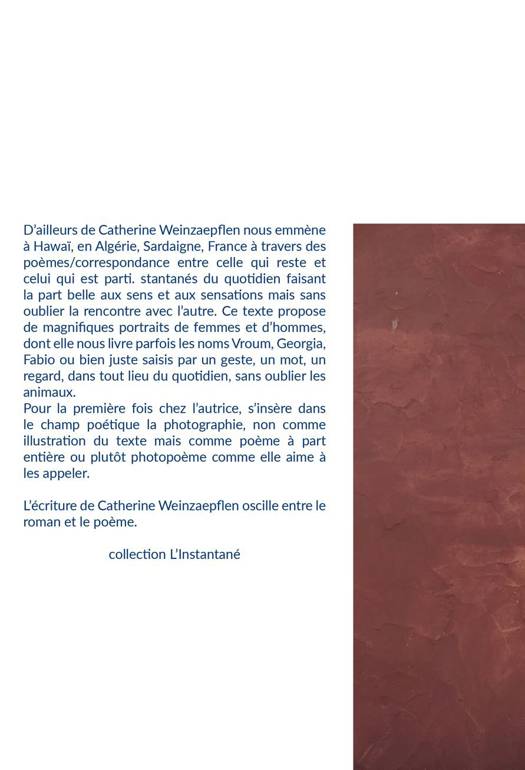 D’ailleurs de Catherine Weinzaepflen nous emmène à Hawaï, en Algérie, Sardaigne, France à travers des poèmes/lcorrespondance entre celle qui reste et celui qui est parti. Instantanés du quotidien faisant la part belle aux sens et aux sensations mais sans oublier rencontre avec l’autre. Ce texte propose de magnifiques portraits de femmes et d’hommes, dont elle nous livre parfois les noms Vroum, Georgia, Fabio ou bien juste saisis par un geste, un mot, un regard, dans tout lieu du quotidien, sans oublier les animaux. Pour la première fois chez elle, s’insère dans le champ poétique la photographie, non comme illustration du texte mais comme poème à part entière ou plutôt photopoème comme elle aime à les appeler. Photographies de paysage, d’objet, de détails de maison, elles deviennent partie du livre à part entière. Paysages, repas, vie quotidienne, petites histoires, mais aussi actualité, la poésie de Catherine Weinzaepflen parle du monde comme il va.