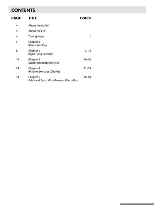 (Essential Elements Guitar). A good warm-up session can be the most crucial part of your practice session. Not only does it limber and stretch your finger muscles, it helps to ward off injuries, gets your hands in "sync," and promotes accuracy and speed. This book contains a wide variety of exercises to help get your hands in top playing shape. It addresses the basic elements of guitar warm-ups by category: stretches and pre-playing coordination exercises, picking exercises, right and left-hand synchronization, and rhythm guitar warm-ups. The Odds & Ends chapter covers other misc. topics such as legato warm-ups, string-bending exercises, scale sequences, and arpeggios. Use this book daily, choosing one or two exercises in each chapter to warm up, and you'll playing will be cleaner, more articulate, and of a higher caliber. The price of this book includes access to audio tracks online, for download or streaming, using the unique code inside the book! Now including PLAYBACK+, a multi-functional audio player that allows you to slow down audio without changing pitch, set loop points, change keys, pan left or right available exclusively from Hal Leonard.