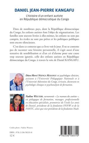 Dans de nombreux pays, dont la République démocratique du Congo, les enfants autistes font l'objet de stigmatisation. Les familles sont souvent livrées à elles-mêmes, les enfants ne sont pas compris, les écoles ne sont pas prêtes et les politiques publiques sont encore silencieuses. C'est dans ce contexte que ce livre voit le jour. Il ne se contente pas de raconter une histoire personnelle, il s'agit aussi d'une tentative de sensibilisation et d'un cri d'alarme pour une cause trop souvent ignorée, celle des enfants autistes en République démocratique du Congo, à travers la voix de Daniel KANGAFU.