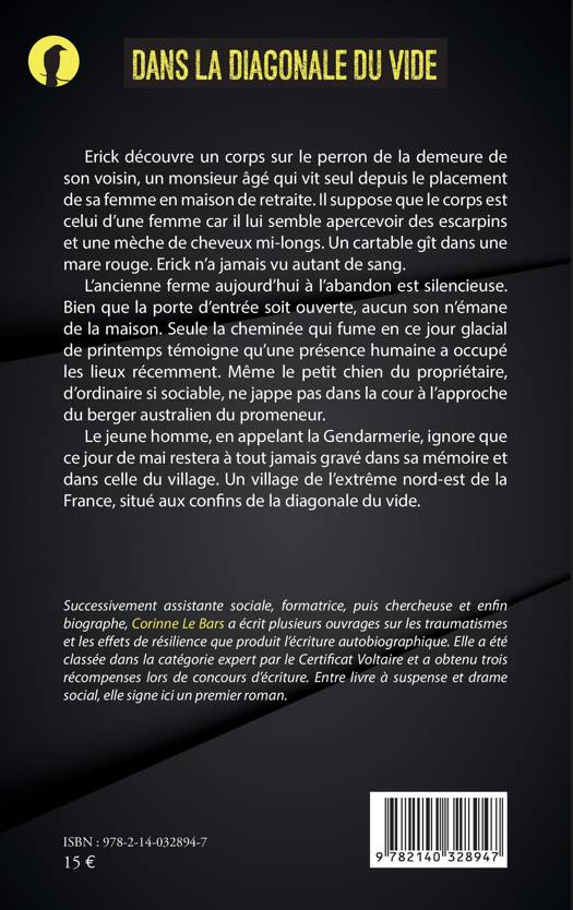 Erick découvre un corps sur le perron de la demeure de son voisin, un monsieur âgé qui vit seul depuis le placement de sa femme en maison de retraite. Il suppose que le corps est celui d'une femme car il lui semble apercevoir des escarpins et une mèche de cheveux mi-longs. Un cartable gît dans une mare rouge. Erick n'a jamais vu autant de sang. L'ancienne ferme aujourd'hui à l'abandon est silencieuse. Bien que la porte d'entrée soit ouverte, aucun son n'émane de la maison. Seule la cheminée qui fume en ce jour glacial de printemps témoigne qu'une présence humaine a occupé les lieux récemment. Même le petit chien du propriétaire, d'ordinaire si sociable, ne jappe pas dans la cour à l'approche du berger australien du promeneur. Le jeune homme, en appelant la Gendarmerie, ignore que ce jour de mai restera à tout jamais gravé dans sa mémoire et dans celle du village. Un village de l'extrême nord-est de la France, situé aux confins de la diagonale du vide.