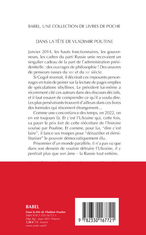 Janvier 2014, en Russie, les hauts fonctionnaires, les gouverneurs, les cadres du parti Russie unie reçoivent un singulier cadeau de Nouvel An de la part de l'administration présidentielle : des ouvrages de philosophie ! Des oeuvres de penseurs russes du XIXe et XXe siècle. Si Gogol revenait, il décrirait ces imposants personnages en train de peiner sur la lecture de pages emplies de spéculations sibyllines. Le président lui-même a récemment cité ces auteurs dans des discours décisifs, et il faut essayer de comprendre ce qu'il a voulu dire. Les plus persévérants trouvent d'ailleurs dans ces livres des formules qui résonnent étrangement, et sentent comme une concordance des temps... Dans cet essai, Michel Eltchaninoff tente de répondre à la question que chacun se pose depuis l'annexion de la Crimée, l'intervention en Syrie, et plus encore en 2022 : qu'est-ce que Poutine a dans la tête ?
