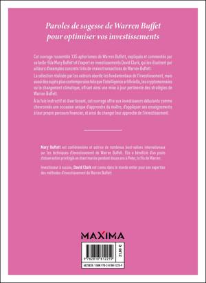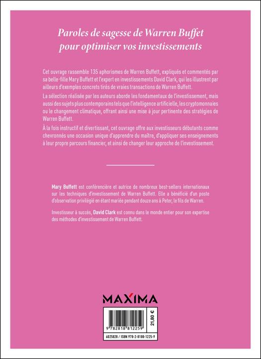 Cet ouvrage rassemble 135 aphorismes de Warren Buffett, commentés et illustrés par Mary Buffett (sa belle-fille) et David Clark. Chaque aphorisme est accompagné d'une explication et d'exemples concrets tirés de vraies transactions de Warren Buffett. La sélection réalisée par les auteurs aborde les fondamentaux de l’investissement, mais aussi des sujets plus contemporains tels que l'intelligence artificielle, les crypto-monnaies ou le changement climatique offrant ainsi une mise à jour pertinente des stratégies de Warren Buffett. À la fois instructif et divertissant, cet ouvrage offre aux investisseurs débutants comme chevronnés une occasion unique d'apprendre du maître, d'appliquer ses enseignements à leur propre parcours financier et ainsi de changer leur approche de l’investissement.