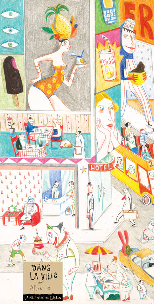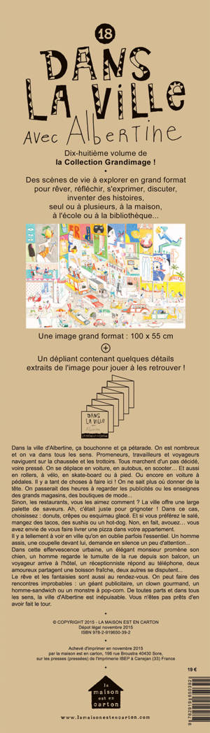 Dans la ville d'Albertine, ça bouchonne et ça pétarade ! On est nombreux et on va dans tous les sens. Promeneurs, travailleurs et voyageurs naviguent sur la chaussée et les trottoirs. Tous marchent d'un pas décidé, voire pressé. On se déplace en voiture, en autobus, en scooter… Et aussi en rollers, à vélo, en skate-board ou à pied. Ou encore en voiture à pédales. Il y a tant de choses à faire ici ! la ville d'Albertine est inépuisable. Vous n'êtes pas prêts d'en avoir fait le tour.