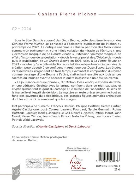 Sous le titre Dans le courant des Deux Beune, cette deuxième livraison des Cahiers Pierre Michon se consacre à l’éclatante publication de Michon au printemps de 2023. La critique unanime a salué la parution des Deux Beune comme « un événement », « une infinie variation du miracle de l’écriture », une « extension magique de La Grande Beune ». Extension vraiment magique, en effet : l’historique de sa gestation – depuis le vaste projet de L’Origine du monde puis la publication de La Grande Beune en 1996 jusqu’à La Petite Beune en 2023 – montre qu’une telle rédaction aura habité quelque trente-cinq années de création pour aboutir à ce confluent magnétique des Deux Beune. Les études ici rassemblées s’organisent en trois temps, examinant la composition du roman comme passage d’une Beune à l’autre, s’attachant ensuite aux puissances sacrées du langage avant d’aborder la quête inlassable d’un désir souverain.